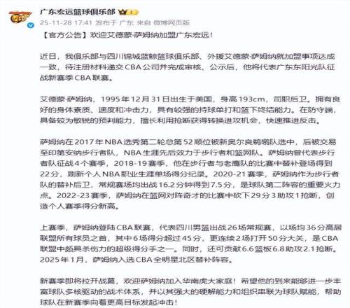 如此勇猛之人,在四川男篮就有些埋没人才了,恰好四川男篮陷入欠薪风暴,广东男篮发起冲击,最终如愿拿到了萨姆纳的优先续约权,并且在11月28日下午完成了官宣,萨姆纳加盟广东男篮了。