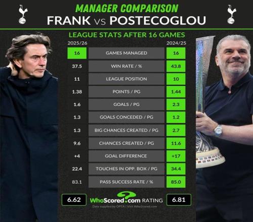 客场0-3不敌诺丁汉森林后,托马斯-弗兰克在北伦敦所承受的压力进一步加大,这赛季球队的比赛风格以及糟糕的主场战绩已经让球迷的不满情绪不断升温,Whoscored也对比了弗兰克本赛季前16轮和上赛季澳波前16轮的数据。