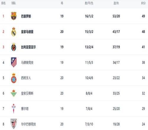 在积分榜上,巴萨16胜1平2负,拿到49分排名榜首。皇马赢球后紧追巴萨。皇马的积分是48分,只落后巴萨1分。不过,巴萨比皇马少赛一场。比利亚雷亚尔总积分是41分,排名第3。第4的是马竞,只拿到38分。西班牙人这匹黑马的总积分达到34分,排名第5。皇家贝蒂斯以32分排名第6。塞尔塔29分,排名第7。