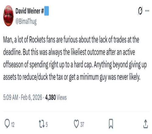 火箭媒体人David Weiner曝出休城0交易的原因之一:“许多火箭球迷因为交易截止日前球队没有操作而感到愤怒,但考虑到火箭队休赛期已经完成过大手笔操作,球队薪金空间又十分紧张,除非是为了避税或者签约底薪球员,否则管理层的确没必要为了交易而交易。”