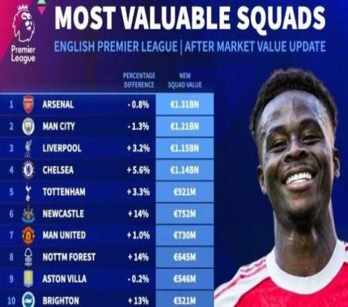 英超球队身价榜:阿森纳13.1亿欧居首,曼城第二利物浦第三 -